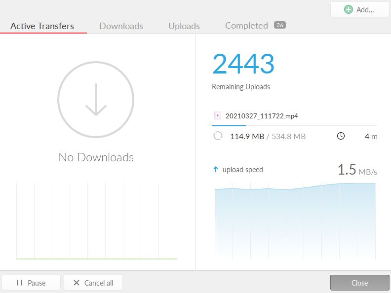 MEGA has a really beautiful screen implemented with everything that a power user requires. The main screen shows the active file being transferred, speed and ETA.