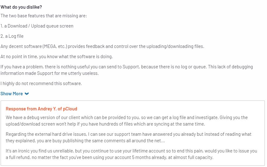 At this point in time I realized that there is no way for me to continue using their product. Moreover, I was even afraid of using their platform because I believed they could erase my data on their pCloud and easily blame it on me – since there is no log!